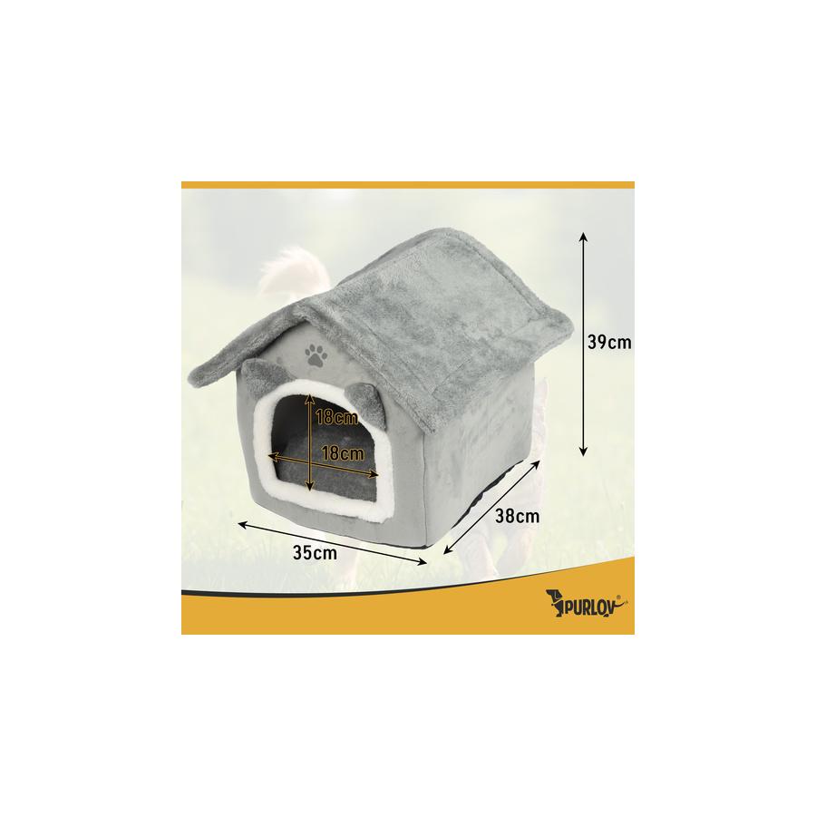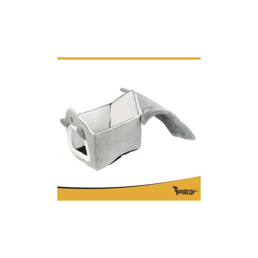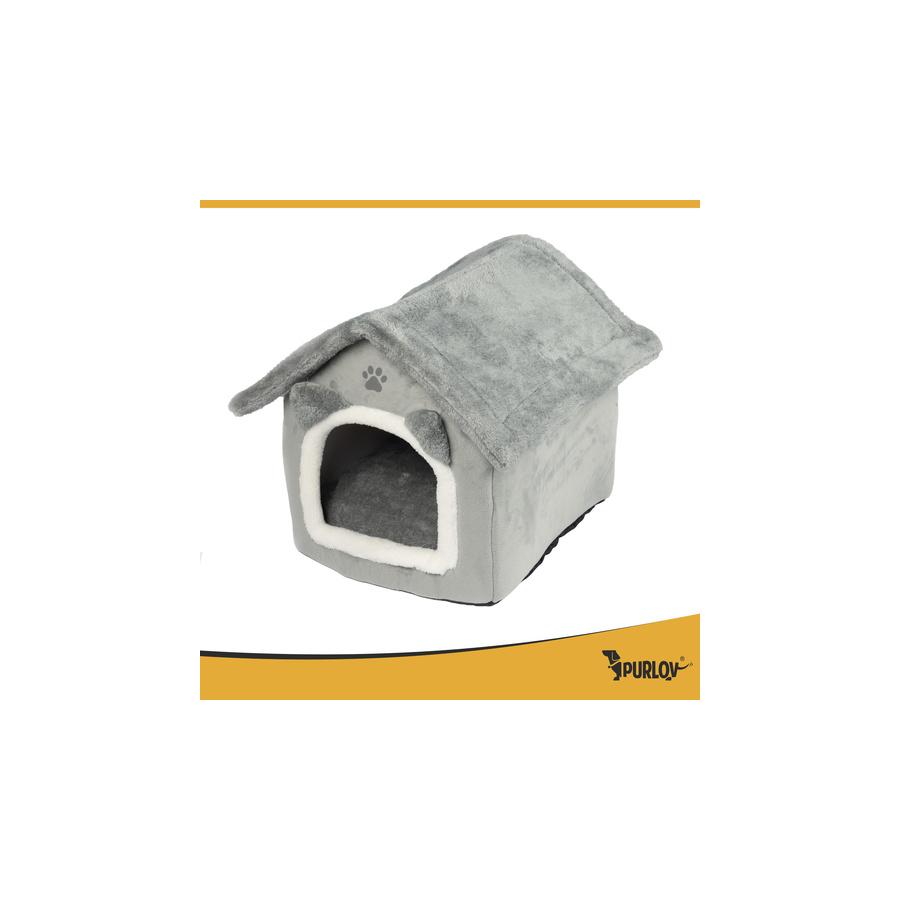 Plyšový pelech/domček pre mačky Purlov je miestom, kde váš maznáčik nájde každý deň útechu a pohodlie. Mäkký vankúš a obalové steny vytvárajú dokonalý úkryt na spánok a relax, zatiaľ čo protišmyková základňa a odnímateľná strecha zabezpečujú pohodlie aj pre majiteľa. Nie je to len pelech – je to malý raj šťastia pre vašu mačku.