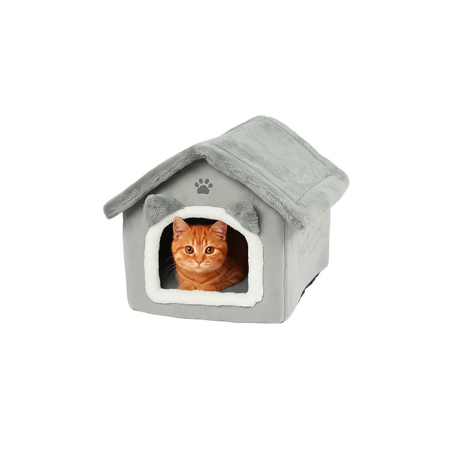Mačací pelech - domček v sivej farbe, vyrobený z vysoko kvalitného materiálu a navrhnutý podľa najnovších módnych trendov.