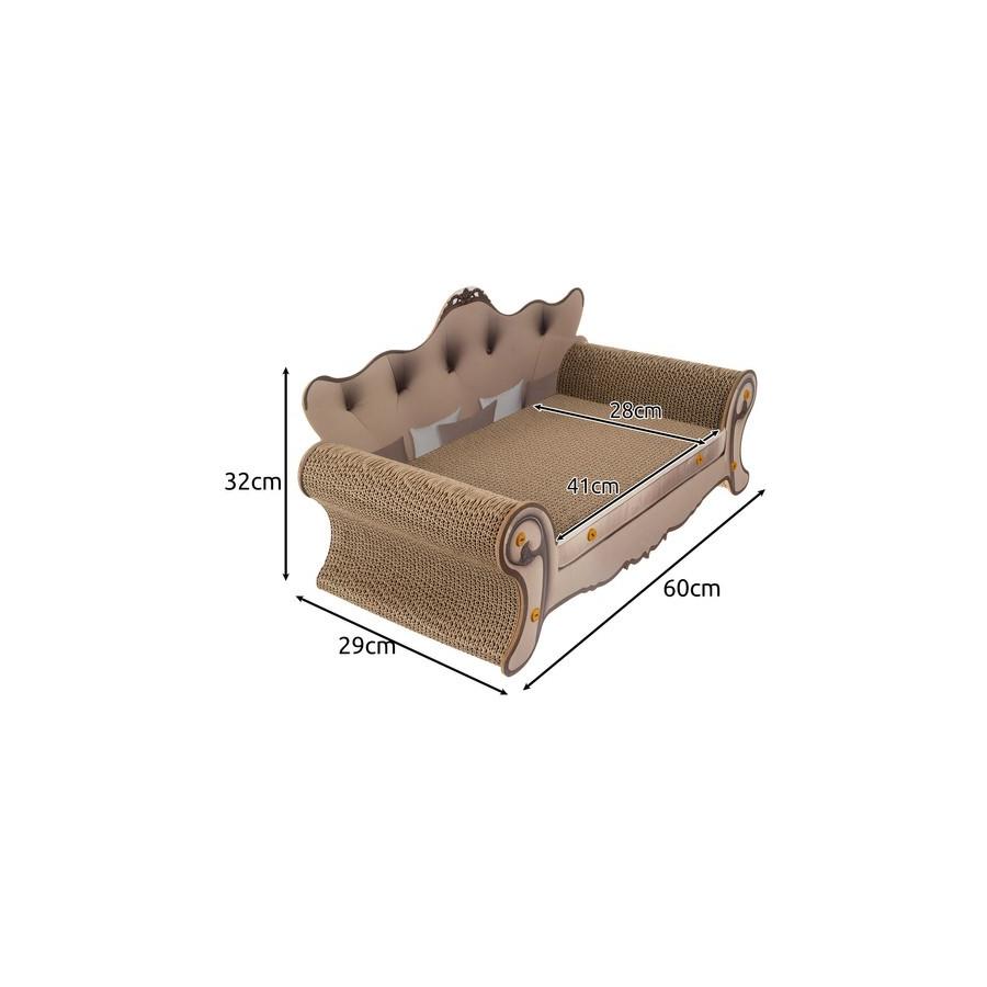 ODOLNÉ MATERIÁLY - škrabadlo je vyrobené z vrstveného lisovaného kartónu s mimoriadnou odolnosťou, ktorá zaručuje dlhodobé používanie. Vlnitá lepenka je ideálna na brúsenie pazúrov, spĺňa požiadavky vašej mačky na škrabanie a zároveň chráni váš domáci nábytok pred poškodením. Zadná a predná časť postele imituje starožitnú pohovku a je vyrobená z kvalitnej MDF dosky, ktorá dodáva celku elegantný vzhľad a zaisťuje pevnosť konštrukcie.