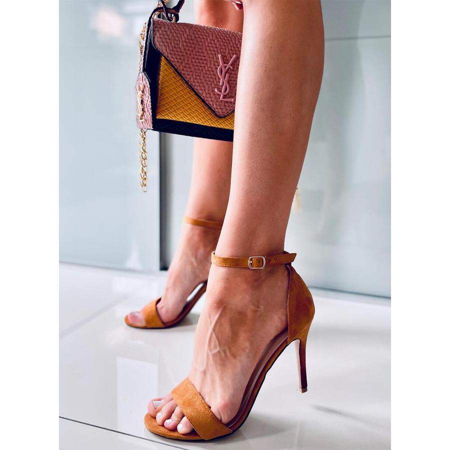 Dámske semišové sandále na štíhlom podpätku v hnedej farbe, vyrobené z vysoko kvalitného materiálu a navrhnuté podľa najnovších módnych trendov.