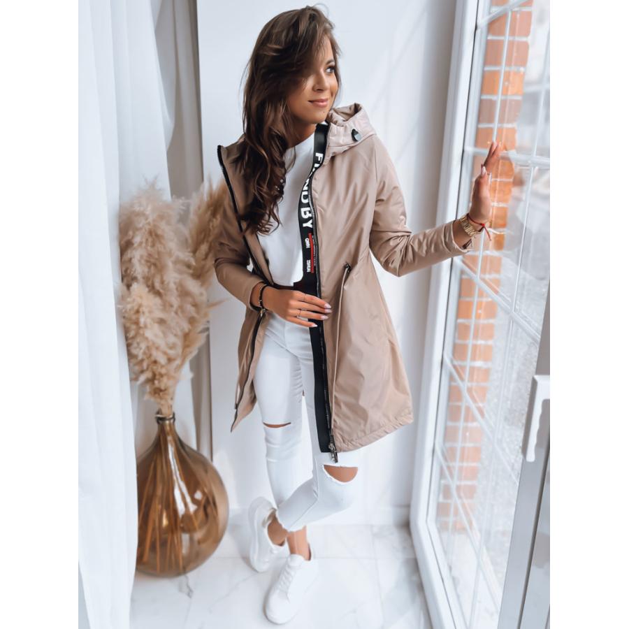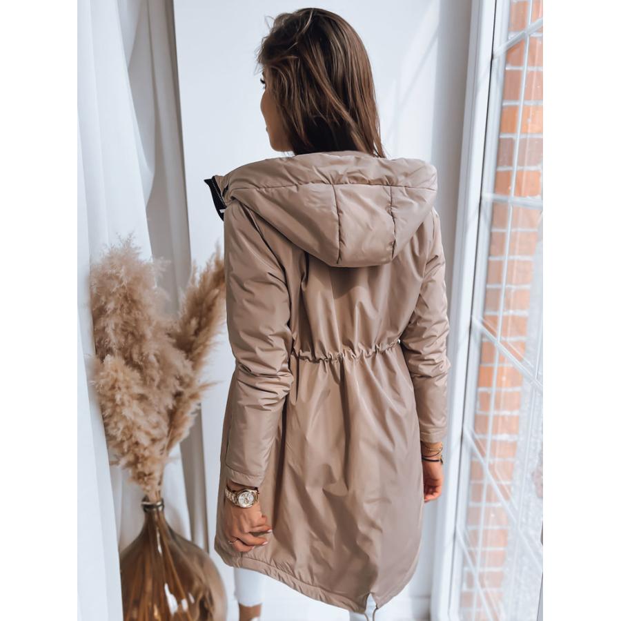 Dámska dlhšia bunda v khaki farbe so šnúrkou v páse, vyrobená z vysoko kvalitného materiálu a navrhnutá podľa najnovších módnych trendov.